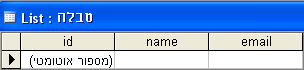<%Do while not rs.EOF%> <tr> <td width="5%"><%=rs("id")%></td> <td width="20%"><%=rs("name")%></td> <td width="30%"><a href="mailto:<%=rs("email")%>"><%=rs("email")%></a></td> <td><a href="Edit.asp?id=<%=rs("id")%>">עריכה</a></td> <td><a href="Delete.asp?id=<%=rs("id")%>">מחיקה</a></td> </tr> |